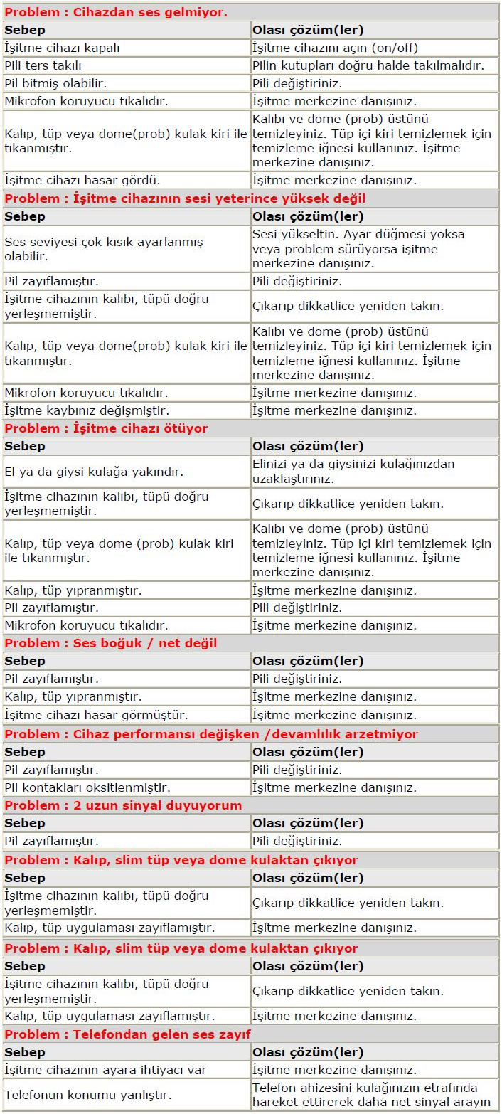 İşitme cihazınızı servise götürmeden ortaya çıkabilecek problemlere ve çözüm önerilerine bir göz atmak işe yarayacaktır. Burada belirtilmeyen bir sorunla karşılaşırsanız işitme merkezinize danışmanızda fayda vardır. İşitme cihazları gelişmiş elektronik aygıtlar olduğundan kendiniz hiçbir zaman tamir etmeye kalkışmayınız.